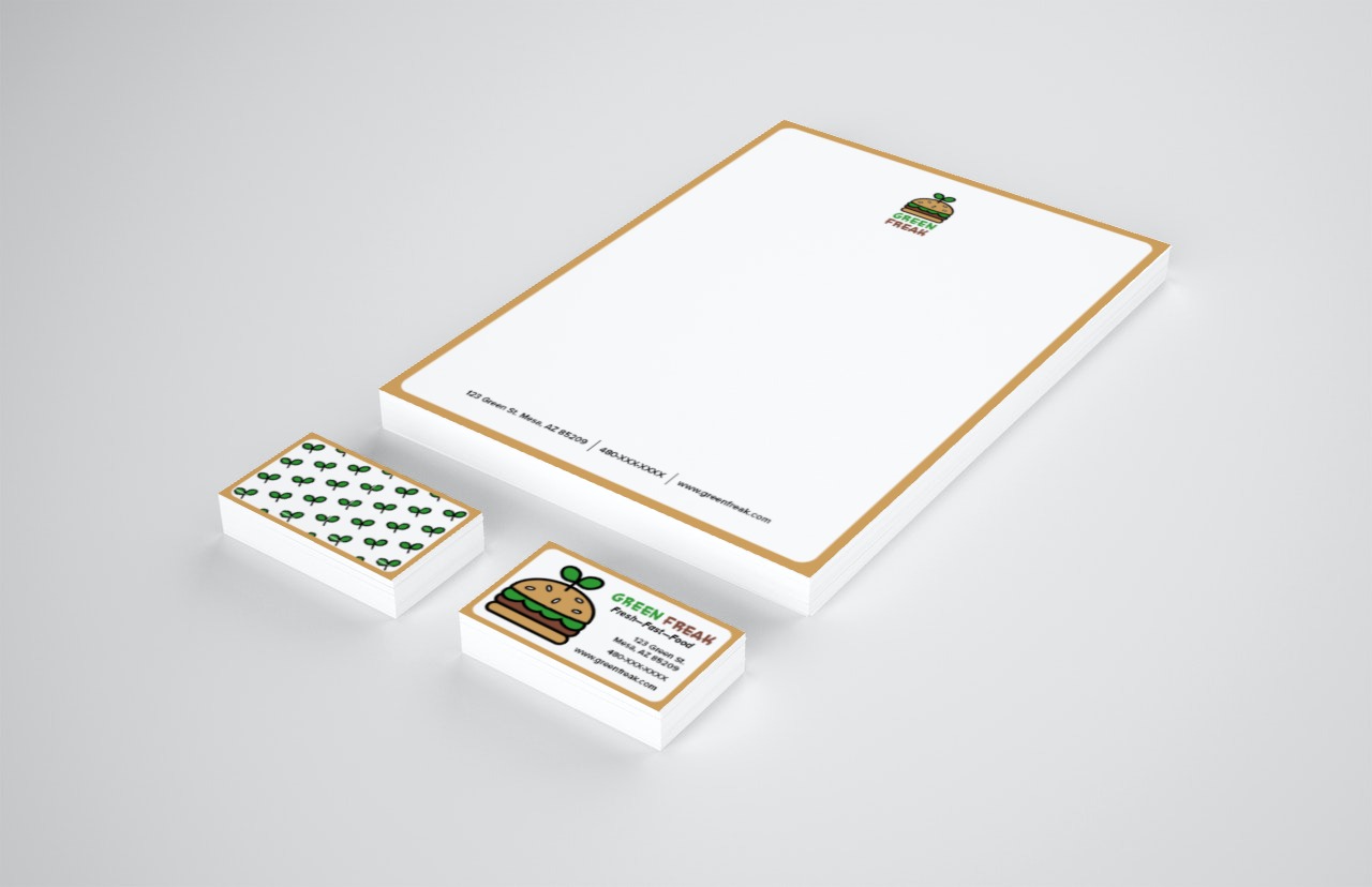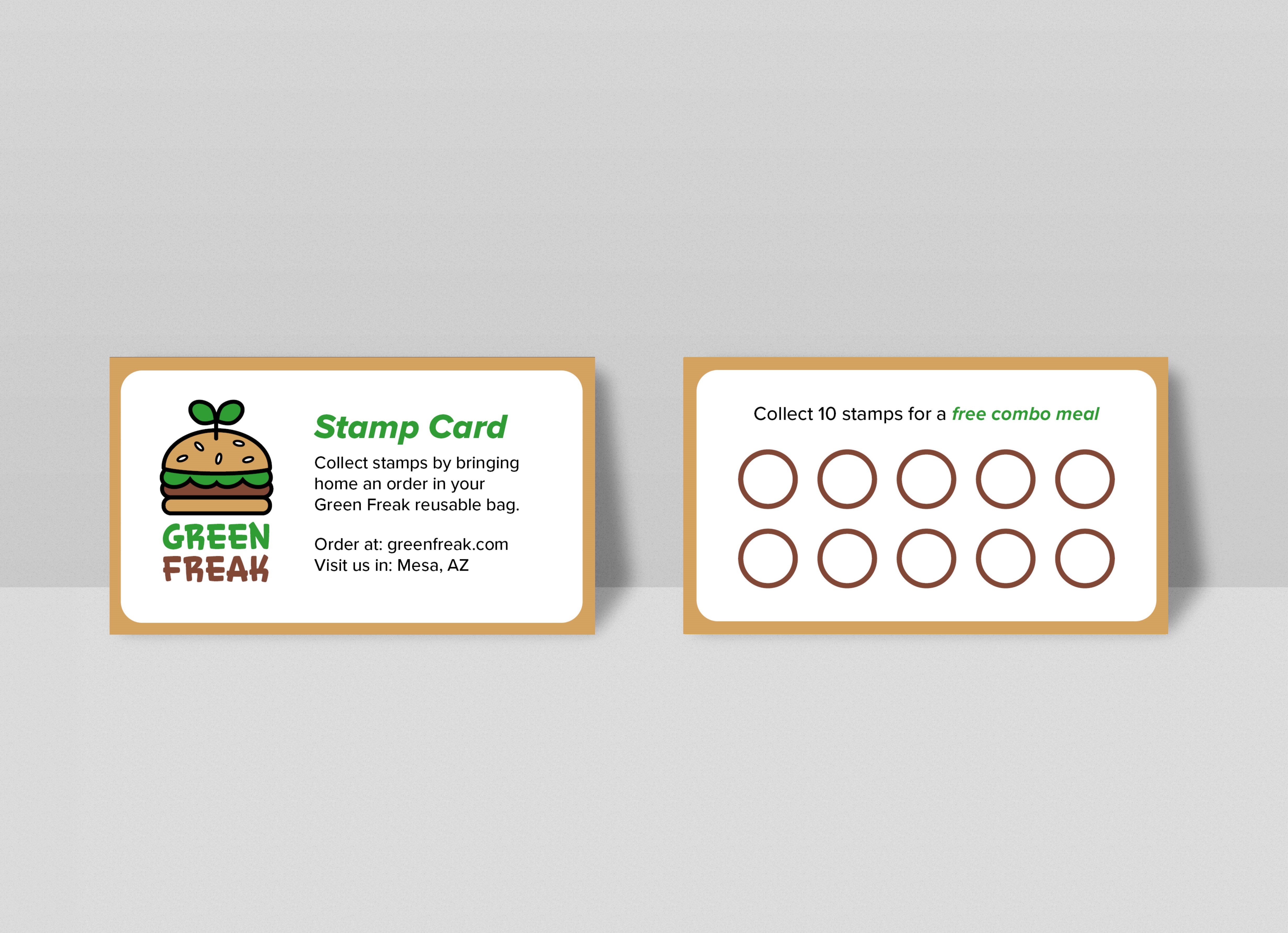 This branding and collateral design was created as a part of my undergraduate honors thesis and culminating senior project. My interests in both graphic design and sustainability inspired me to dive into research on sustainable practices in the contemporary fast food landscape. Based on that research, I created original branding for a hypothetical fast food restaurant that boasts its sustainable practices, named Green Freak. The branding is then applied to packaging, a menu, business materials, and grand opening collateral.